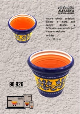 Maceta grande andaluza, pintada a mano, con muchos detalles y decoración renacentista, por lo que es exclusiva. Medidas: 38 × 33 cm 96,92€