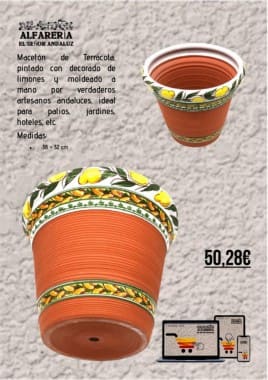 Macetón de Terracota, pintado con decorado de limones y moldeado a mano por verdaderos artesanos andaluces, ideal para patios, jardines, hoteles, etc. Medidas: 38 × 32 cm 50,28€