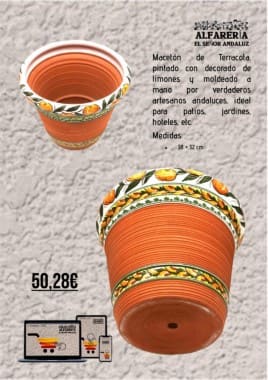 Macetón de Terracota, pintado con decorado de limones y moldeado a mano por verdaderos artesanos andaluces, ideal para patios, jardines, hoteles, etc. Medidas: 38 × 32 cm 50,28€