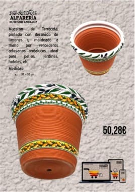 Macetón de Terracota, pintado con decorado de limones y moldeado a mano por verdaderos artesanos andaluces, ideal para patios, jardines, hoteles, etc. Medidas: 38 × 32 cm 50,28€